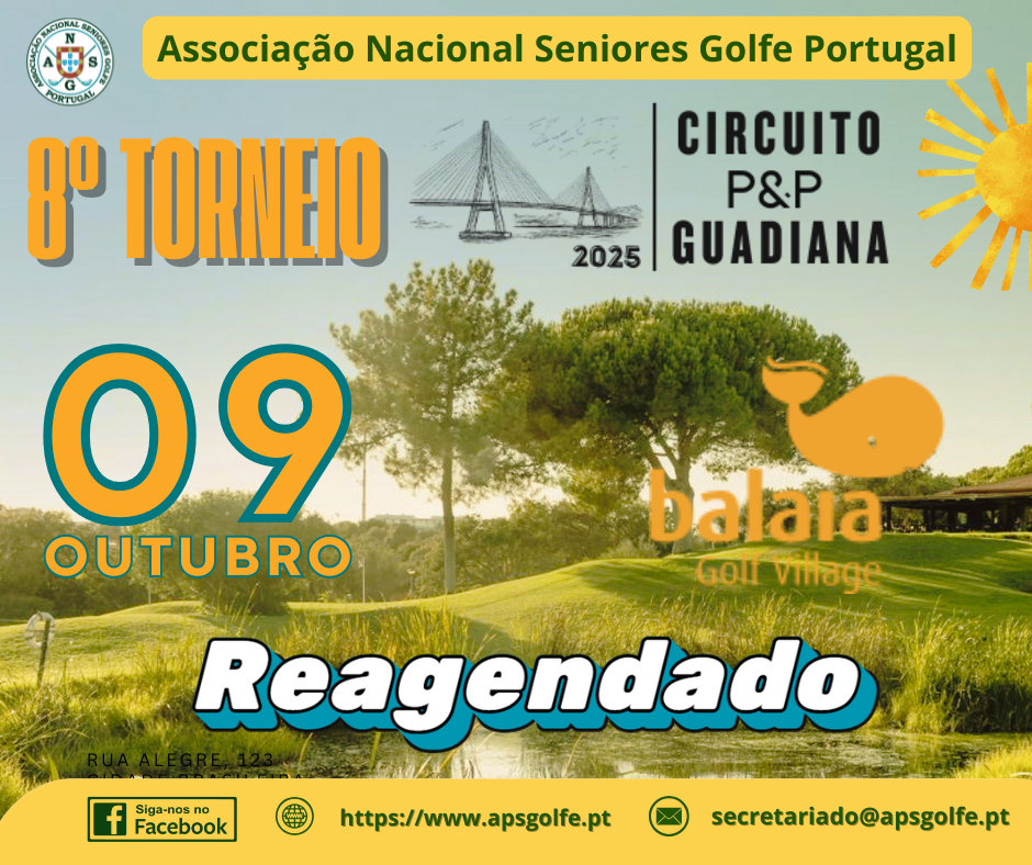 Informamos que o 8º Torneio P&P do Circuito Guadiana, inicialmente agendado para o dia 10 de outubro no campo Balaia Golf Village, foi antecipado para o dia 9 de outubro no mesmo local.