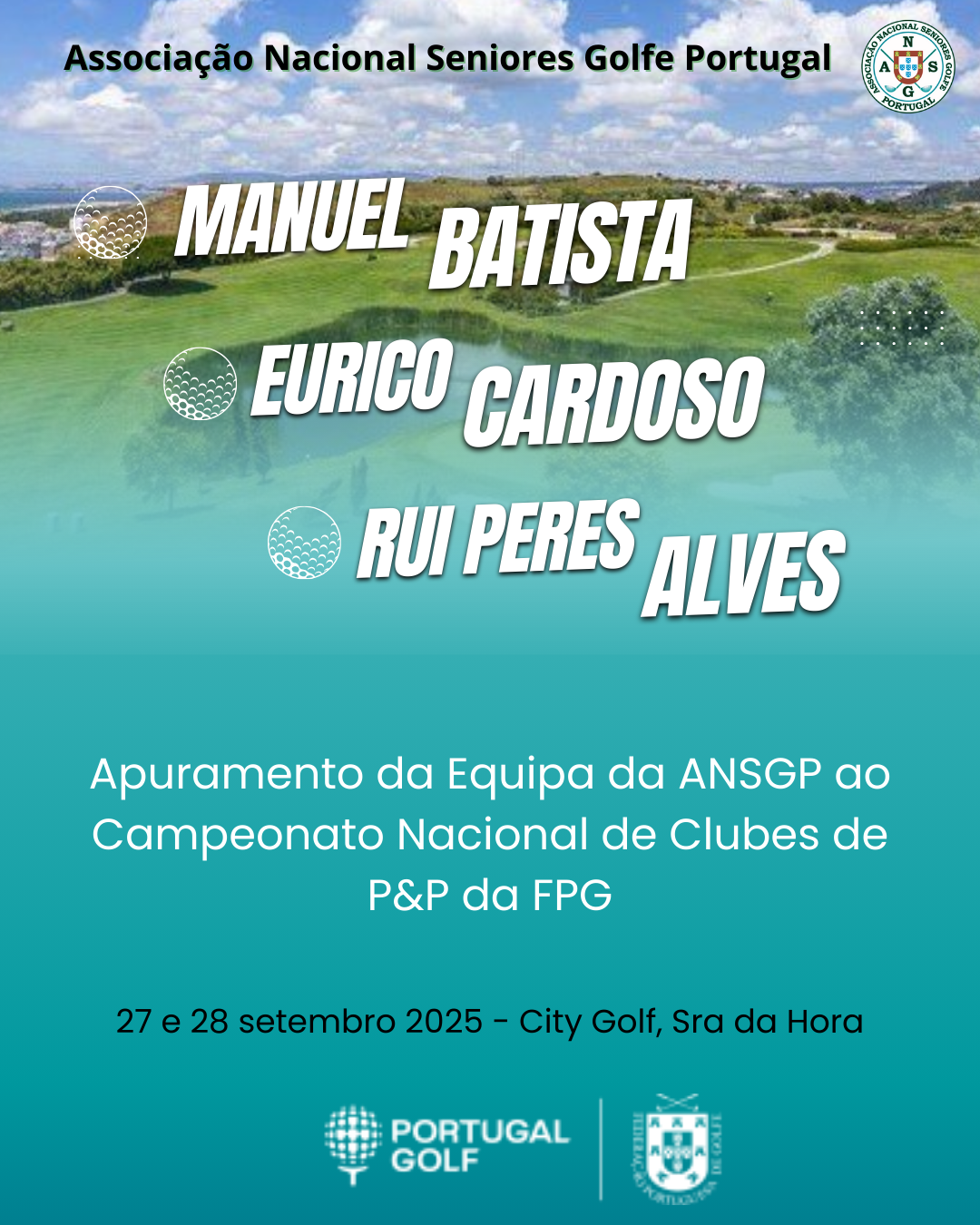 Realizou-se no dia 8 setembro, no Campo Golf Aldeia dos Capuchos, o Torneio de Apuramento da Equipa P&P da Associação Nacional Seniores Golfe Portugal. Nesta prova foram apurados os três primeiros classificados da categoria Medal Gross: Manuel Batista, Eurico Cardoso e Rui Peres Alves. Estes jogadores irão representar a nossa associação no Campeonato Nacional de Clubes Pitch & Putt, a disputar no City Golf nos dias 27 e 28 de setembro de 2025.
