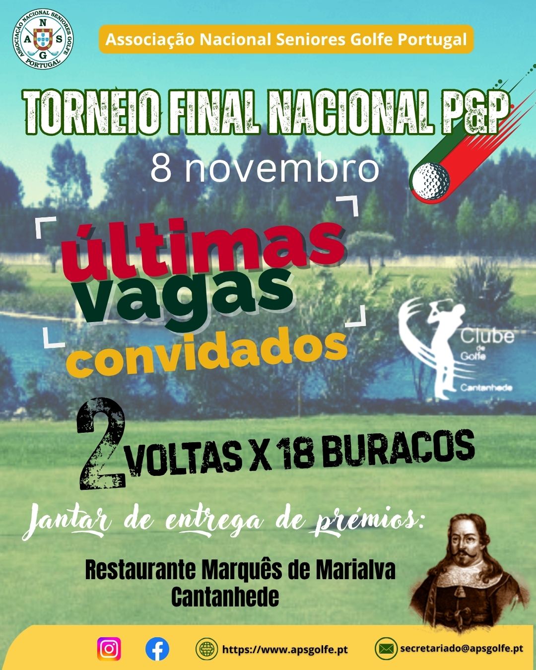 Está quase completo, mas ainda há algumas vagas disponíveis de convidados. Quem quiser participar deve inscrever-se rapidamente para garantir lugar. Mais informação em: https://apsgolfe.pt/torneio/torneio-final-nacional-pp/